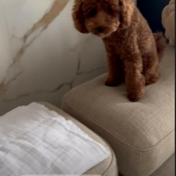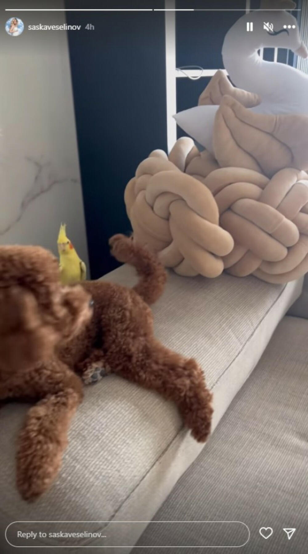 Dok beba spava mlada mama se zabavlja sa svojim ljubimcima, papagajem i pudlom.