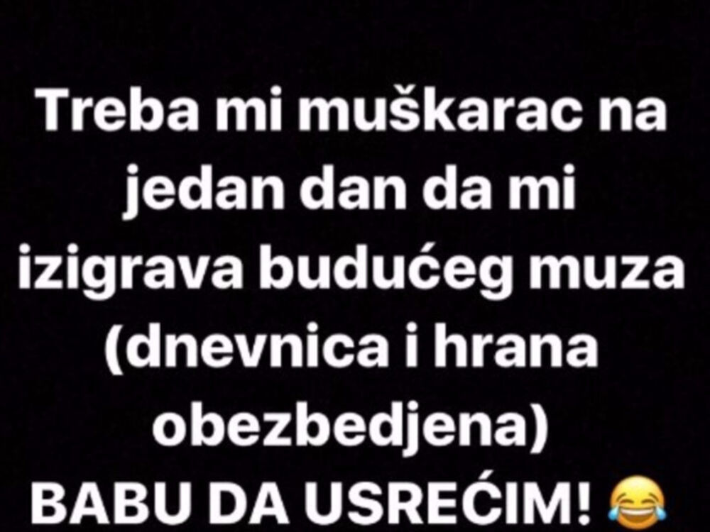 - Treba mi muškarac na jedan dan da mi izigrava budućeg muža, dnevnica i hrana obezbeđeni. Babu da usrećim - podelila je Sofija na sve popularnijem Instastoriju.