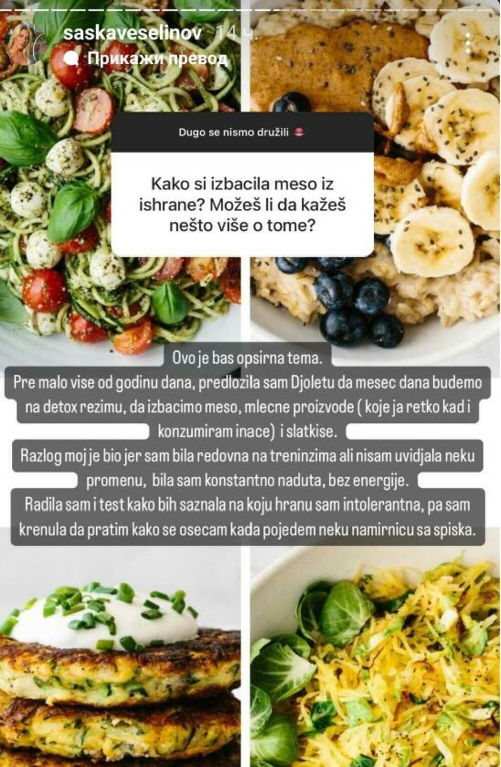 - Pre malo više od godinu dana, predložila sam Đoletu da mesec dana budemo na detoks režimu, da izbacimo meso i mlečne proizvode (koje ja retko kad konzumiram inače) i slatkiše. Razlog moj je bio jer sam bila redovna na treninzima ali nisam uviđala neku promenu, bila sam naduta i bez energije. Radila sam i test kako bih saznala na koju sam hranu intolerantna, pa sam krenula da pratim kako se osećam kada pojedem neku namirnicu sa spiska - otkrila je Saška.