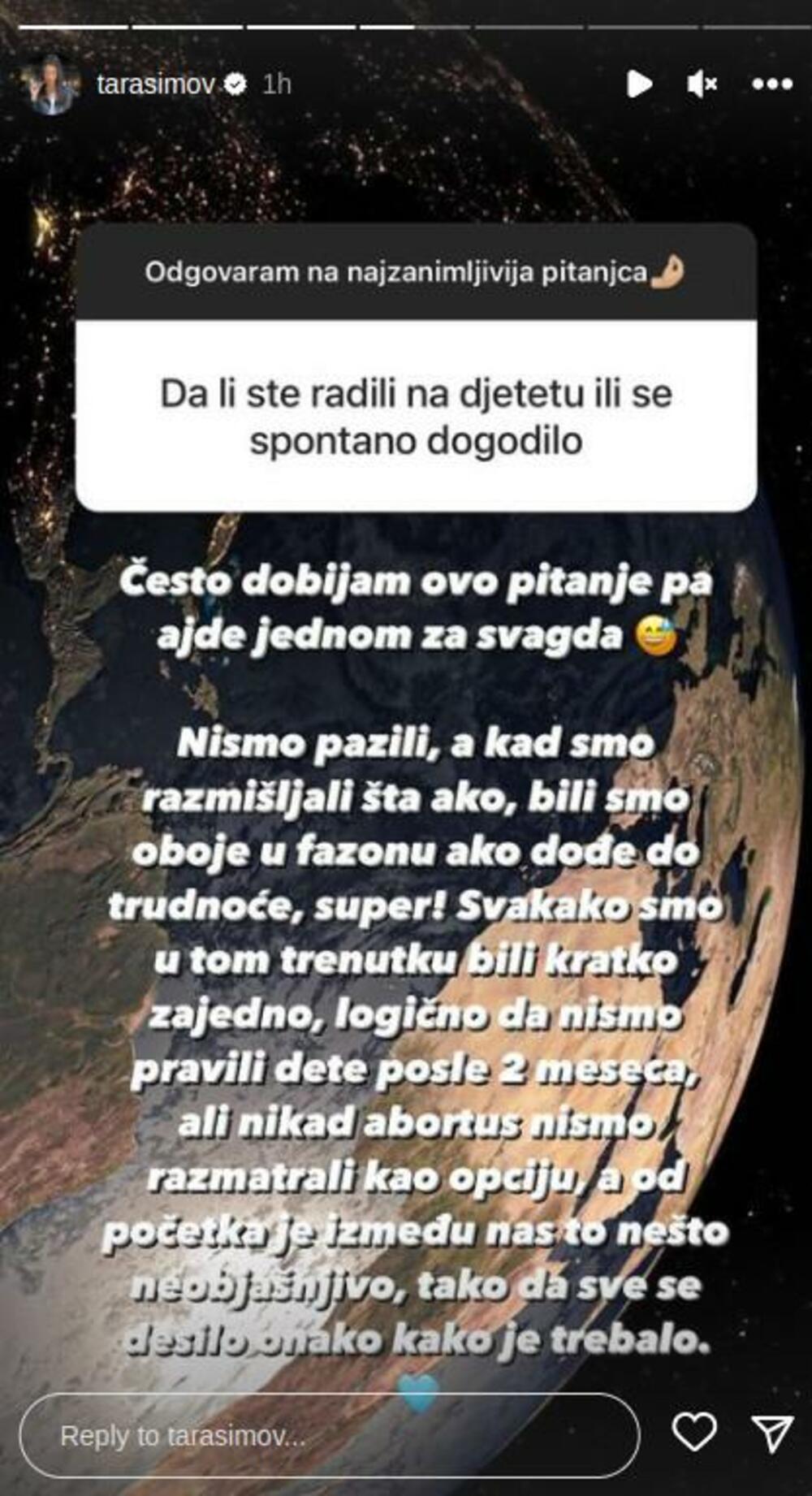 - Često dobijam ovo pitanje, pa bih da odgovorim jednom za svagda. Nismo pazili, a kad smo razmišljali šta ako ostanem trudna smo bili oboje u fazonu - ako dođe do trudnooće, super! Svakako smo u tom momentu kratko bili zajedno. Logično da nismo pravili dete posle dva meseca, ali nikad abortus nismo razmatrali kao opciju. Od početka je imeđu nas bili nešto neobjašnjivo, tako da se sve dogodilo baš kako treba - glasio je detaljan odgovor bivše zadrugarke.