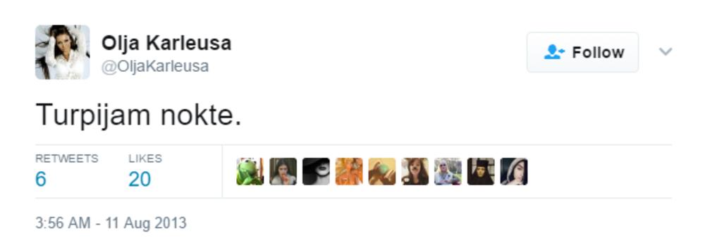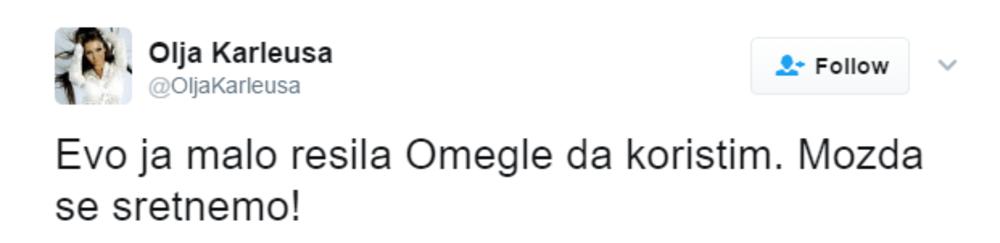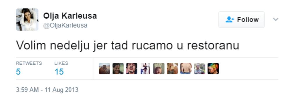 Zaboravljena folk zvezda Olja Karleuša se, ipak, možda neko seća po pesmama kao što su Zicer, Brushalter i Žene lavice, a valjalo bi baciti pogled na njen Twitter profil, koji očigledno nije još uvek naučila da koristi iako je na njemu aktivna još od 2011. godine.