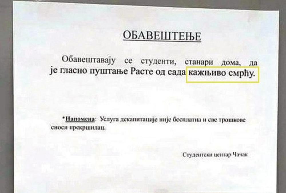 - Usluga dekapitacije nije besplatna i sve troškove snosi prekršilac - stoji na istom papiru, a u potpisu „Studentski centar Čačak“.