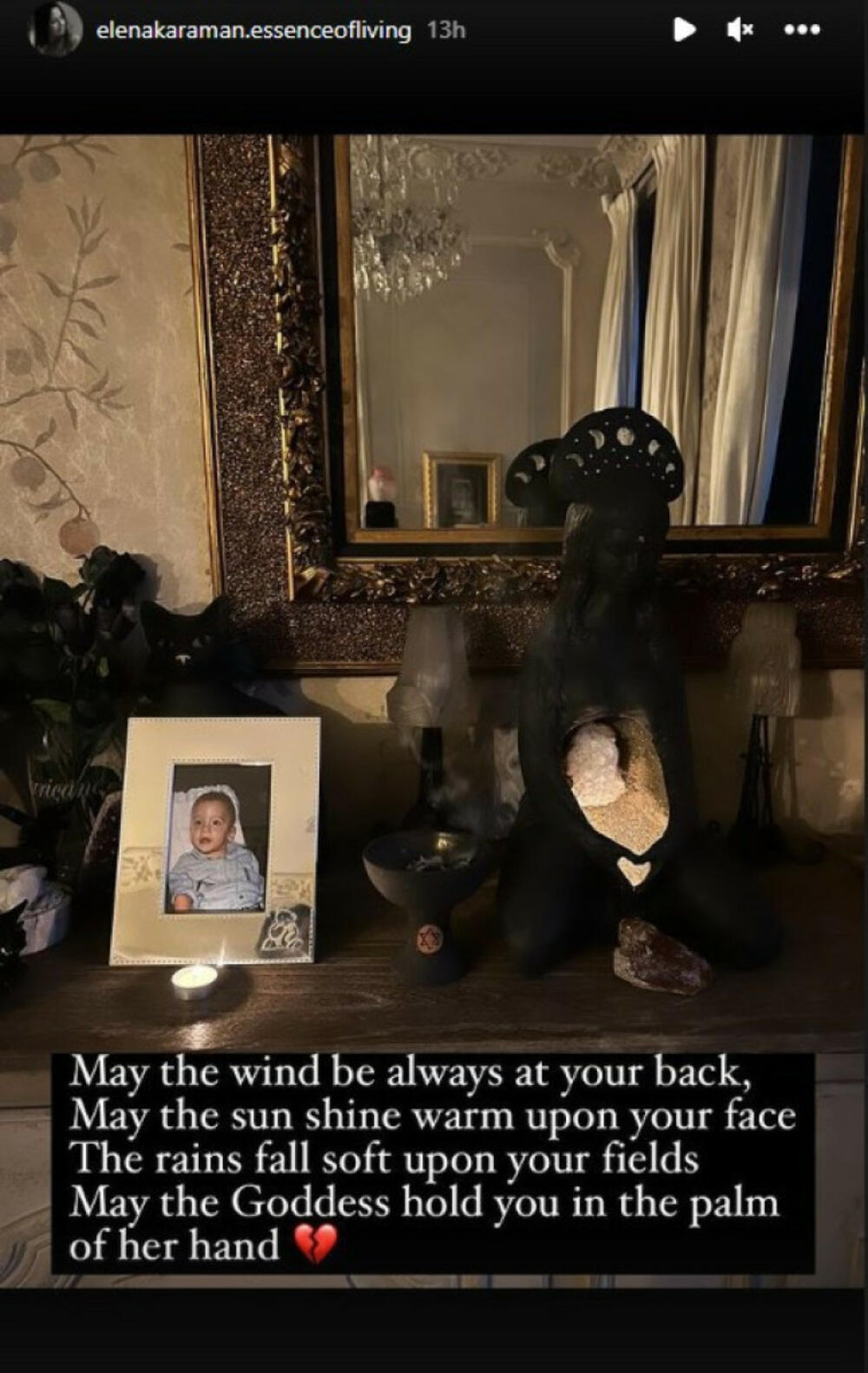 - Neka ti vetar uvek širi krila, neka ti sunce isijava toplotu na lice, neka ti kiša pada nežno po poljima, neka te boginja drži u svojoj ruci - napisala je Elena, dok se u pozadini, u ramu, nalazila fotografija njenog sina i upaljena svećica.