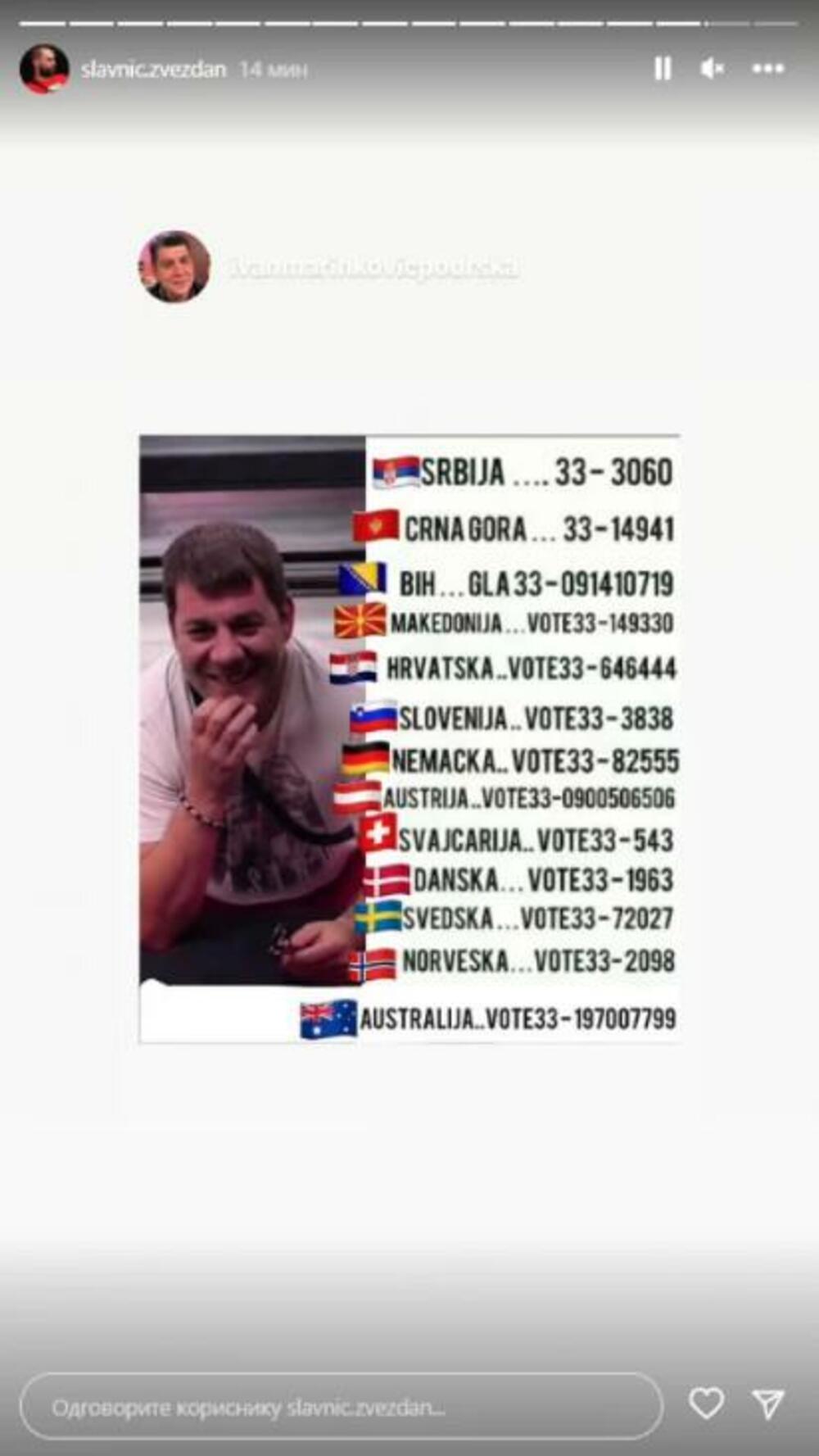 Naime, on je na svom Instagram profilu okačio brojeve za glasanje za Ivana Marinkovića.