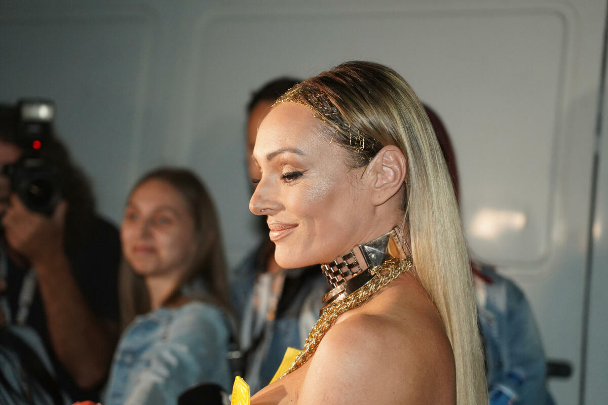 Ona je za ovu priliku izabrala žutu haljinu, a kao modni detalj nosila je zlatne lance. Možemo primetiti da jer pevačica dovela liniju do savršenstva!