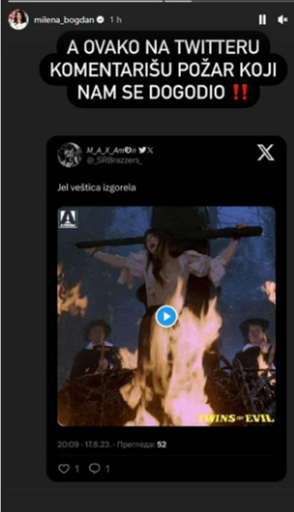 - Je l' veštica izgorela? - stoji u opisu videa koji je objavljen na Tviteru, a Milena Popović je dodala komentar: "A ovako na Tviteru komentarišu požar koji nam se dogodio!"