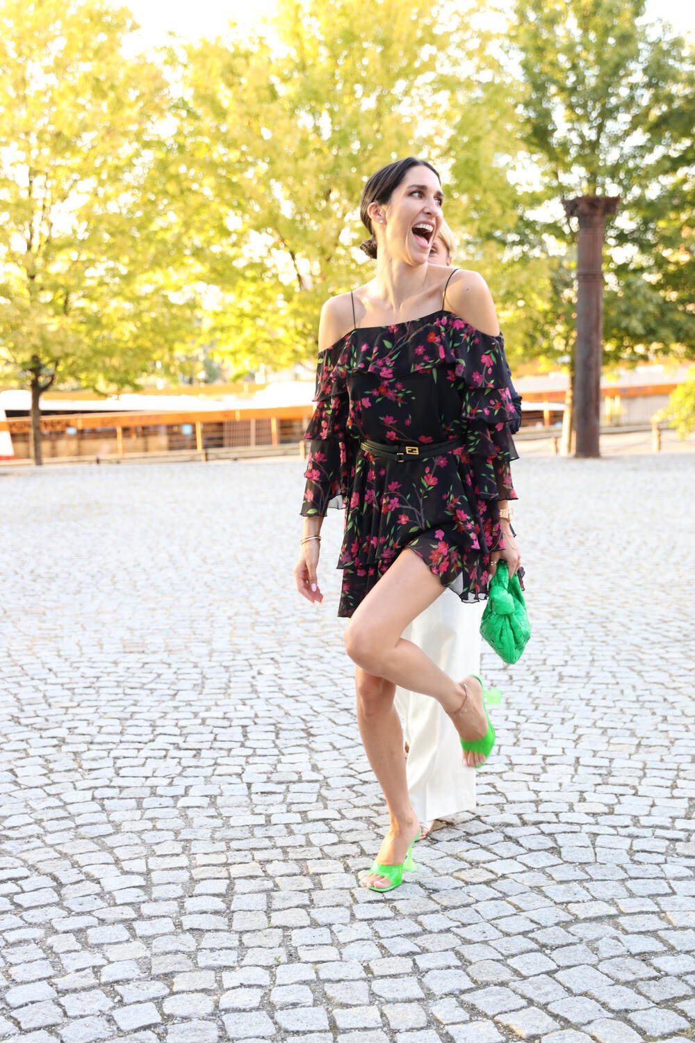 Letnja lepršava haljina je otkrila baš koliko treba, a uz ovu haljinu je izabrala i jake zelene papuče na štiklu kao i torbicu u istoj boji. Imala je i crni kaiš ispod grugi koji je dodatno istakao njen struk.