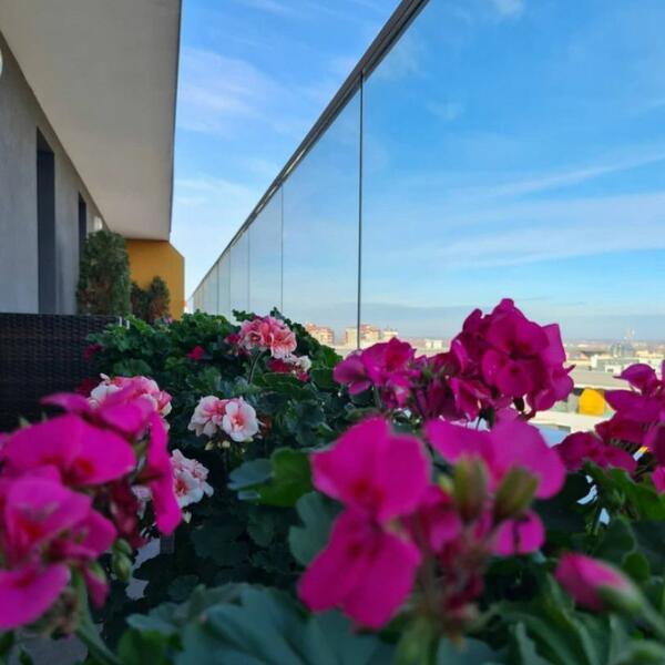 Iz dnevnog boravka izlazi se na prostranu terasu, ispunjenu cvećem, sa koje se pruža čaroban pogled na Beograd.