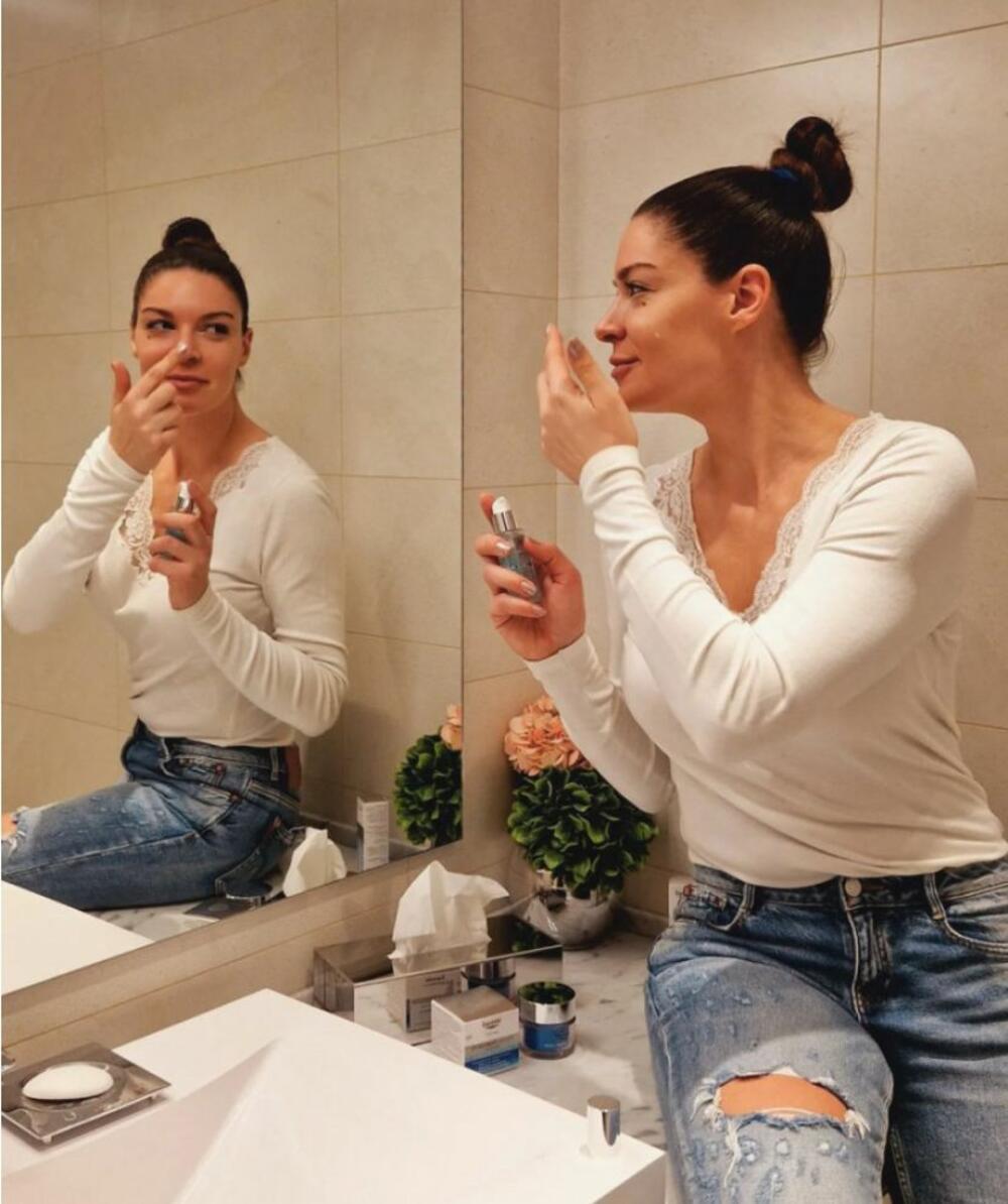 Sanja Kužet je prirodno lepa žena, ali nega nikad nije na odmet, pa pre odlaska u krevet obavezno odvoji vreme za male kozmetičke rituale u kupatilu koje je uređeno u svetlim tonovima, sa modernom tuš-kabinom u staklu.