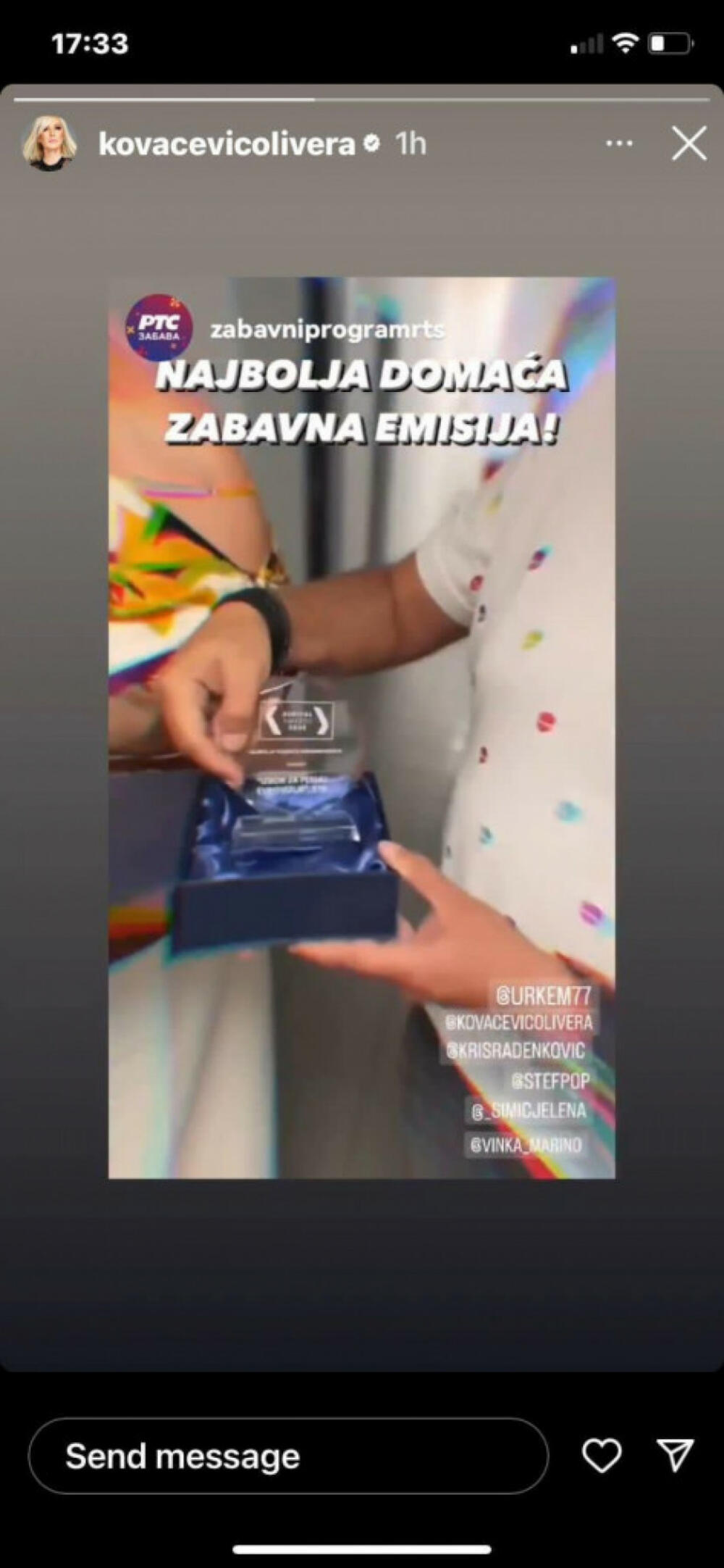 Naime, sinoć je Kristina Radenković Oliveri uručila nagradu za najbolju domaću zabavnu emisiju, a koju je dobila za rad na emisiji "Pesma za Evroviziju".