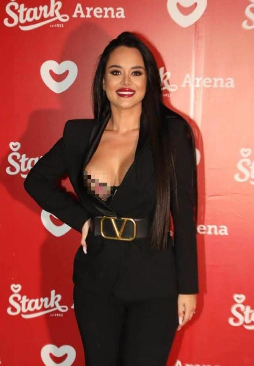 Naime, pevačica je obukla crni sako koji ističe njene silikonske grudi i pantalone u istoj boji. A svi su primetili da je šareni brus "iskočio" iz "V" izraza što je izazvalo opštu pometnju.