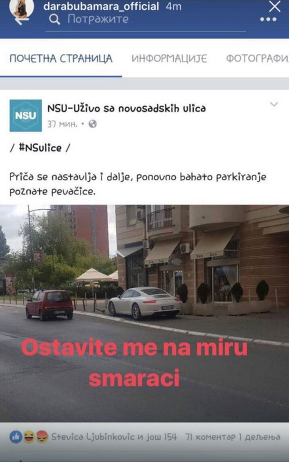 Besni Novosađani uz fotografiju njenog bahatog parkiranja napisali su joj poruku: "Priča se nastavlja i dalje, ponovo bahato parkiranje poznate pevačice", a ona im je uzvratila "Gde nađem rupu ja ga stavim, to je VIP parkiranje".