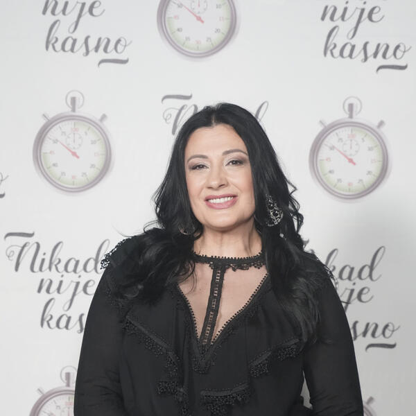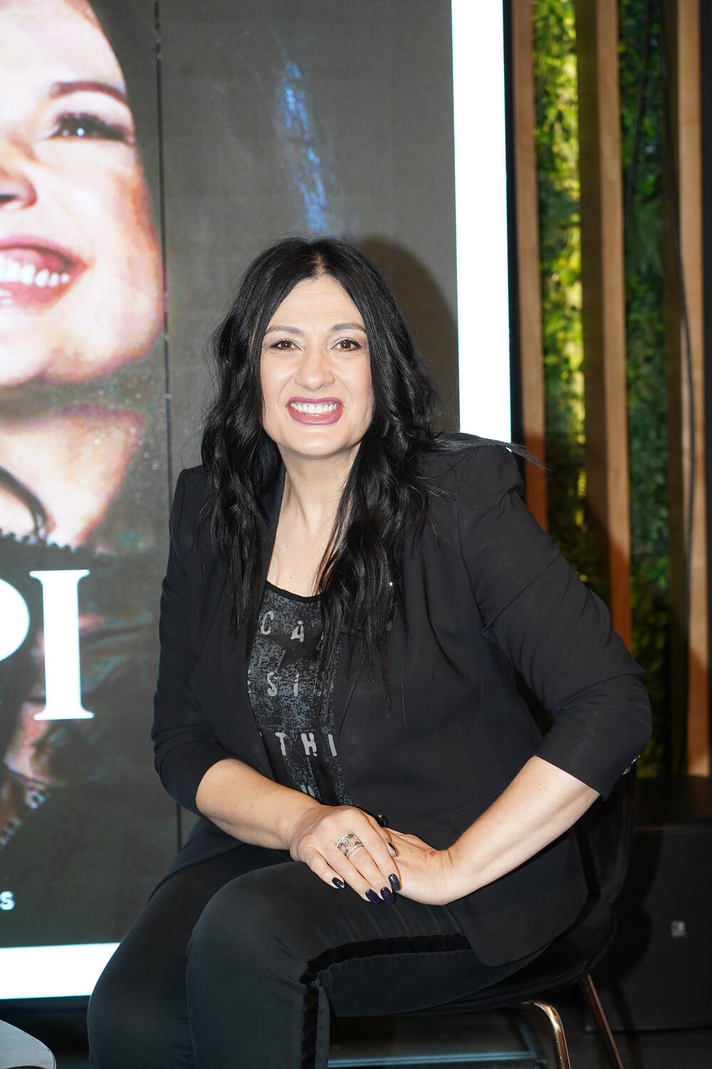 Ona je za ovu priliku izabrala crnu kombinaciju - sako i pantalone, kao i majica sa printom. Svoju dugu crnu kosu nije promenila, ostala joj je verna, a mogla se videti tek neka borica jer su godine učinile svoje.
