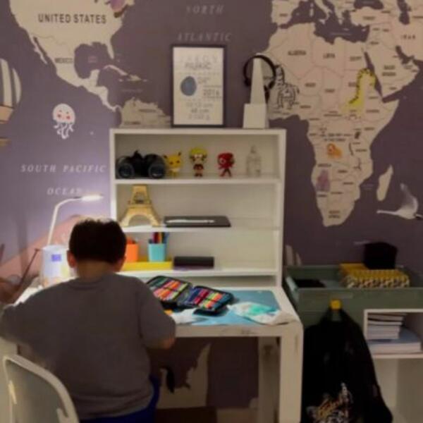 Za radni deo sve je u funkcionalnosti – jednostavni pisaći sto idealan je za domaće zadatke, a na policama pored stola školski ranac i knjige su nadohvat ruke. Na policama iznad stola ima minimalno dekoracije kako se ne bi mnogo skretala pažnja sa zadataka, a njih krase omiljeni likovi iz crtanih filmova.