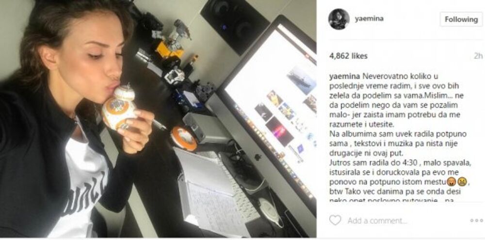 - Jutros sam radila do 4:30 , malo spavala, istuširala se i doručkovala pa evo me ponovo na potpuno istom mestu. Tako već danima, pa se onda desi neko opet poslovno putovanje... Pa repeat. Ovaj mališan koga ljubim zove se BB-8. I baš kao u filmu "Cast Away" sa Tom Henksom, ja i BB-8 jedno drugom smo super podrška. Šalu na stranu, album je pri kraju i dala sam sve od sebe da to bude najbolje i najbrže što može... Treba mi snaga koju pronalazim u vašoj ljubavi i podršci..." napisala je pevačica na Instagramu.