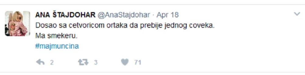 - Došao sa četvoricom ortaka da prebije jednog čoveka. Ma šmekeru - napisala je Ana, a uz post je dodala i haštag "majmunčina".