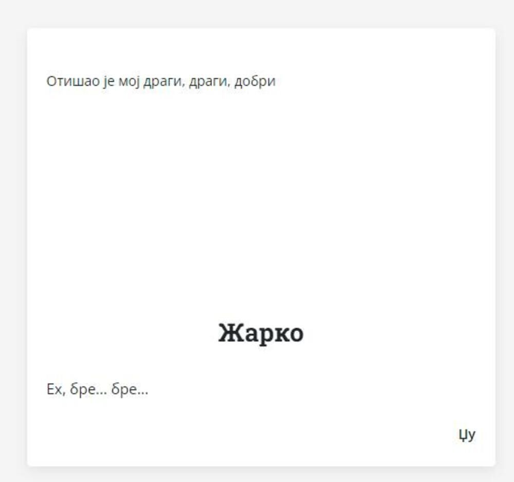 - Otišao je moj dragi, dragi, dobri Žarko. Eh, bre... bre... - a u potpisu stoji Džu. Ostaje pitanje ko je to, ali svakako je neko kome je do Žarka mnogo stalo.