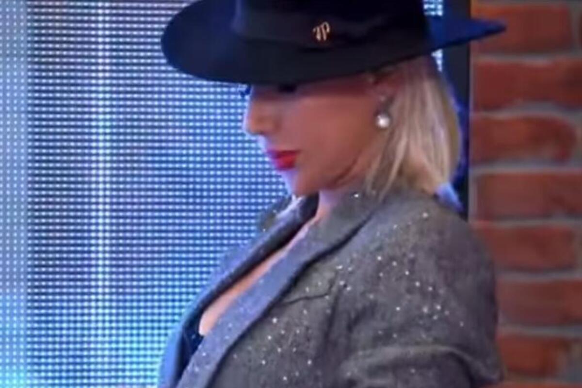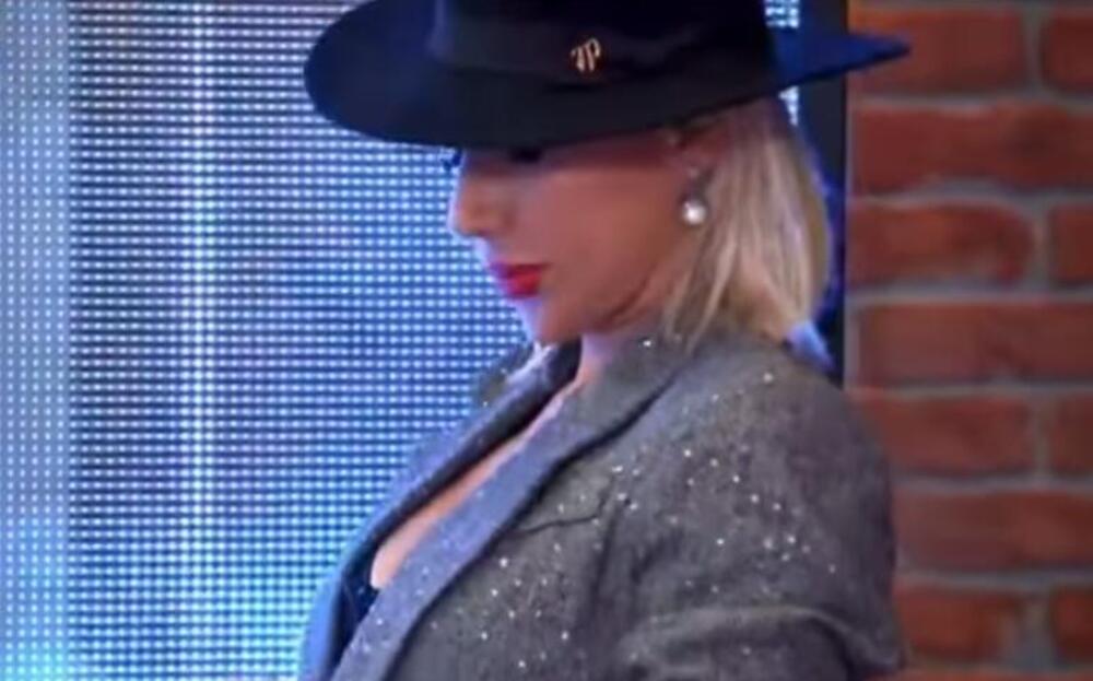 Ona je na sebi imala crnu kratku haljinu i sako sive boje koji je imao na sebi šljokice, a u prvom planu si bile njene bujne grudi.