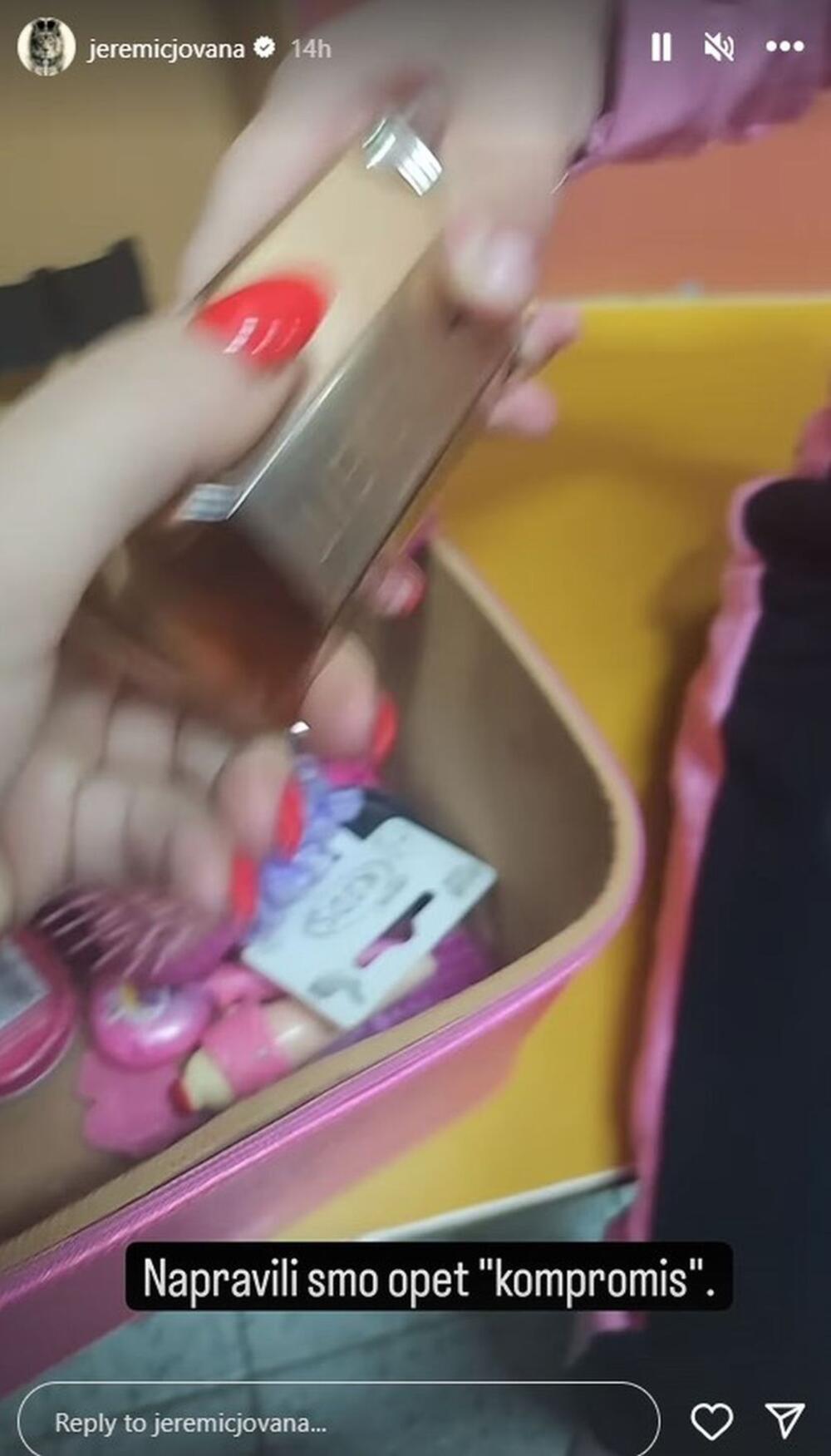 Dok se Jovanina ćerkica preobuvala, voditeljka je snimila sadržaj nesesera u kojem se nalazi samo šminka, napominjemo dečija, ali i jedan skupoceni parfem, piše Telegraf.
