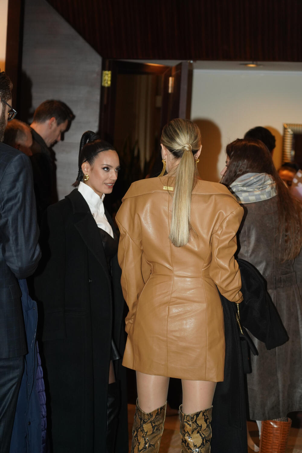 Jelena Gavrilović je nosila mini haljinu u boji kože, koja je pokazala njena ramena, ali i noge. Međutim, glumica je želela da ovu haljinu upari sa čizmama koje su do butina, a u printu zmijske kože.