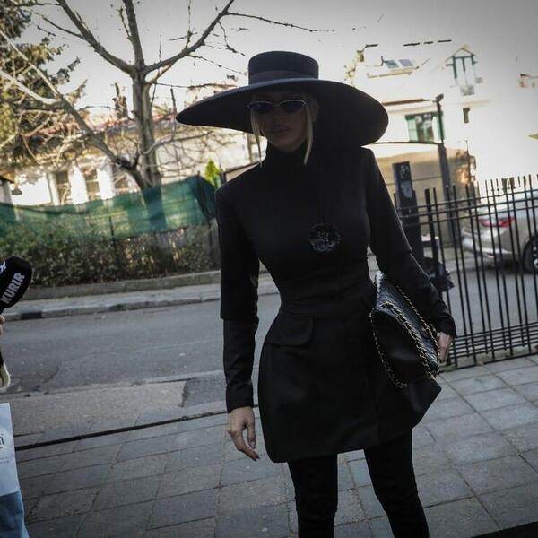 Ogroman crni šešir, naočare, šanel torba, i crna kratka haljina sa crnom ružom na grudima bili su njen izbor za ovaj važan događaj.