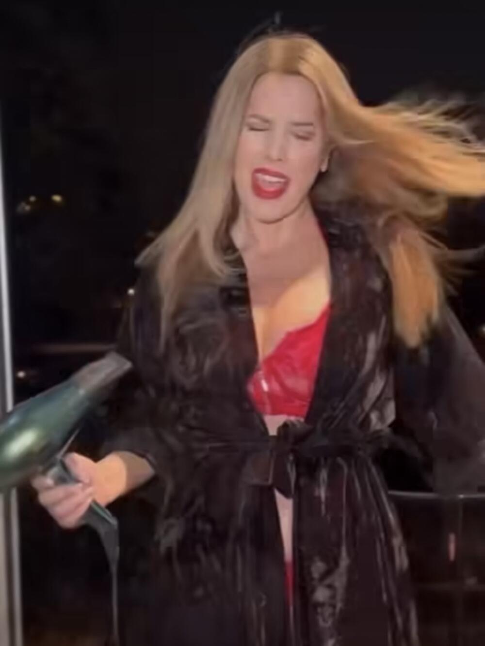 Ona je prvo pokazala kako sređuje kosu, dok se ispod mantila nazirao crveni veš.