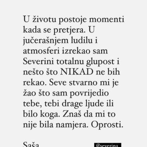 "U životu postoje momenti kada se pretera. U jučerašnjem ludilu i atmosferi izrekao sam Severini totalnu glupost i nešto što NIKAD ne bih rekao. Seve, stvarno mi je žao što sam povredio tebe, tebi drage ljude ili bilo koga. Znaš da mi to nije bila namera. Oprosti. Saša", napisao je pevač na Instagramu.
