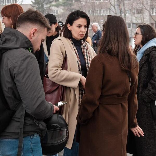 Anđela Jovanović dočekana je aplauzom brojnih kolega koje su došle da je podrže ispred Prvog osnovnog suda u Beogradu .
