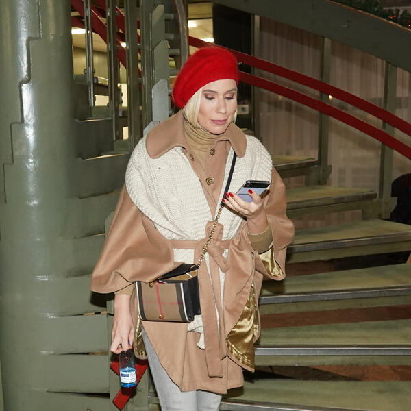 U pitanju su crne lakovane cipele ravnih potpetica, koje samo na prvi pogled podsećaju na baletanke i koje krase dva kaišića preko risa. Marija je obula duge crne svilene čarape, a preko njih kratke bele čarapice uz ovaj efektan par cipela. Ona se u susret lepim danima opredelila i za usku crnu haljinu, koja je bila u vidu rolke i mini dužine, a preko nje je obukla crveni kaput. Uz kaput je ponela i crvenu torbu, dok je pogled sakrila iza velikih naočara za sunce.