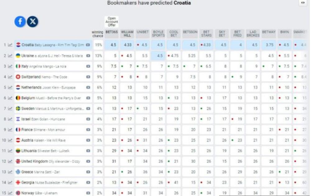 Naime, prema zvaničnim podacima, prvih pet zemalja koje mogu odneti pobedu su: Hrvatska, Ukrajina, Italija, Švajcarska i Holandija.