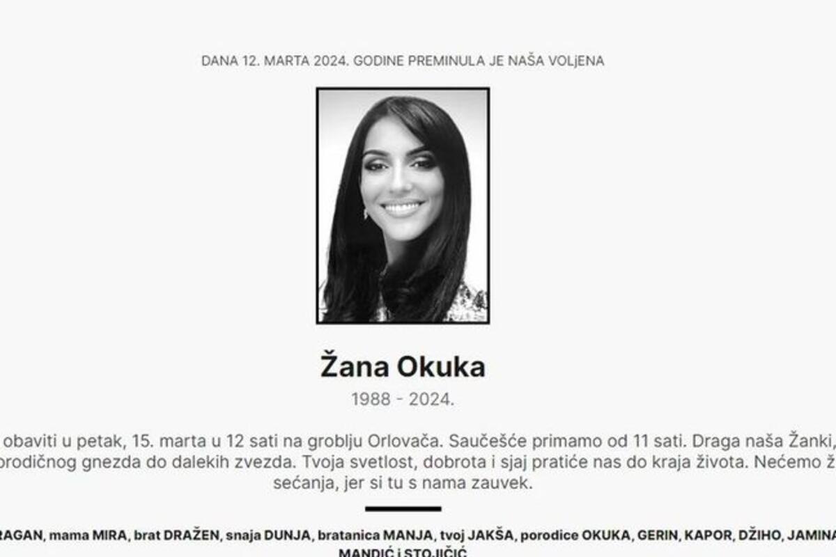 - Sahrana Žane Okuke će se obaviti u petak, 15. marta u 12 časova na groblju Orlovača. Saučešće primamo od 11 sati. Draga naša Žanki, prerano si otišla od porodičnog gnezda, do dalekih zvezda. Tvoja svetlost, dobrota i sjaj, pretiće nas do kraja života. Nećemo živeti od sećanja, jer si tu s nama zauvek - pisalo je u umrilici.