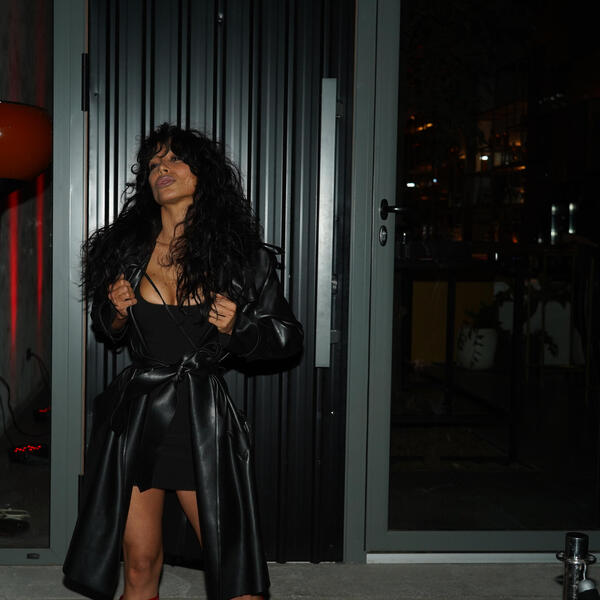 Edita je nosila crni kožni mantil, do je ispod imala crnu kratku haljinu. Tu su i crvene lakovane čizme koje su razblie ovu kombinaciju.