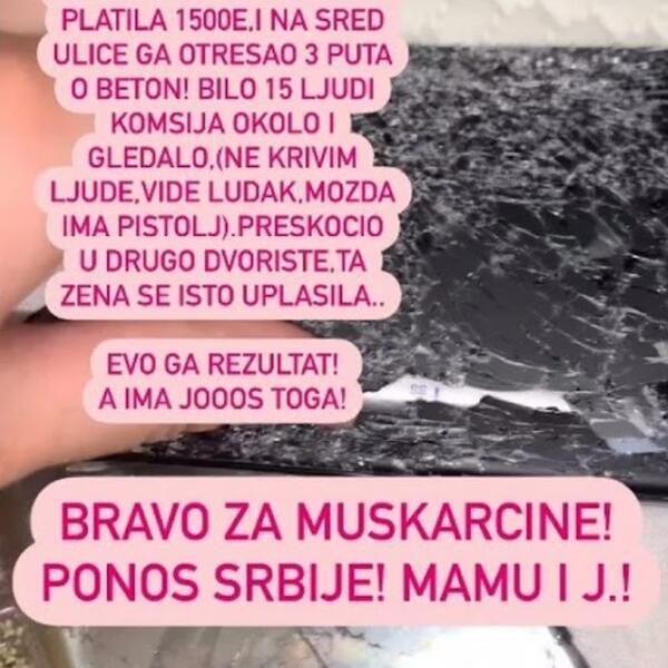 - Oteo mi je telefon iz ruke koji sam pre toga dve nedelje, platila 1500 evra. Bilo je oko mene 15 ljudi i komšija i svi su gledali. Ne krivim ljude jer vide ludaka i pomisle da možda ima poštolj. Evo vam rezultati svega, a ima još mnogo toga. Bravo za muškarce, dodala je.
