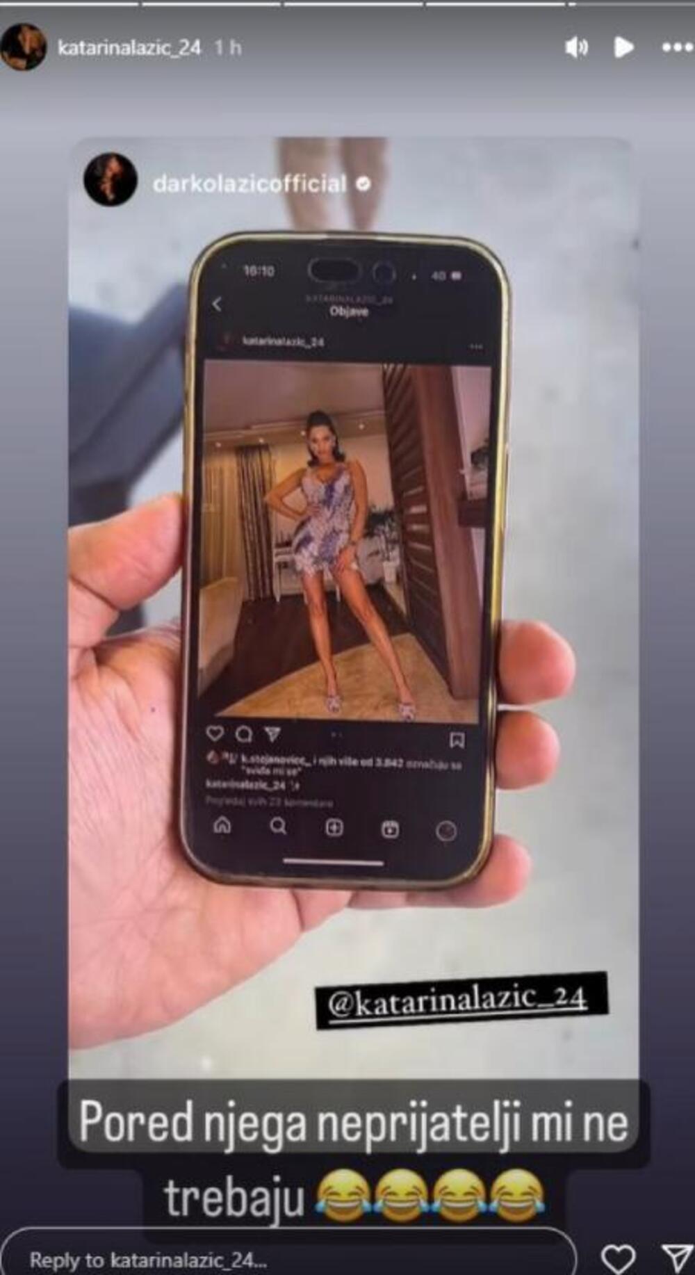 Ovog puta Darko je podelio snimak na kome se vidi jedna atraktivna Katarinina slika sa Instagrama, a potom je kadar podigao i pokazao pravo izdanje njegove žene, koja je bila ležerno obučena i na sebi imala trenerku, široku jaknu i klompe.