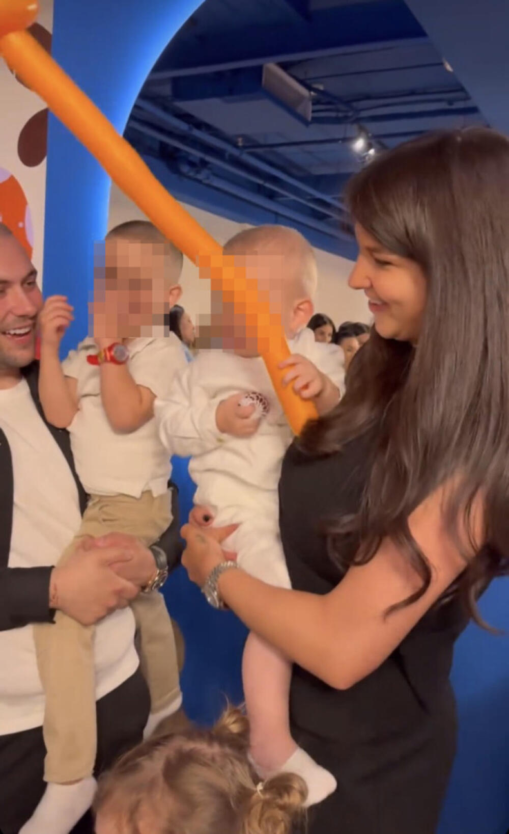 Oni su porodično stigli u jednu luksuznu igraonicu, gde su okupili manji broj rođaka i prijatelja, a ponosni roditelji Marko i Minja pozirali su ispred trospratne torte.