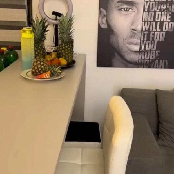 Dnevni boravak spojen je sa malom kuhinjom, a između je šank. Prostorija je u belim tonovima, a po zidovima su fotografije koje je Aleks sama kreirala, što je jednom prilikom i snimila za svoj TikTok.