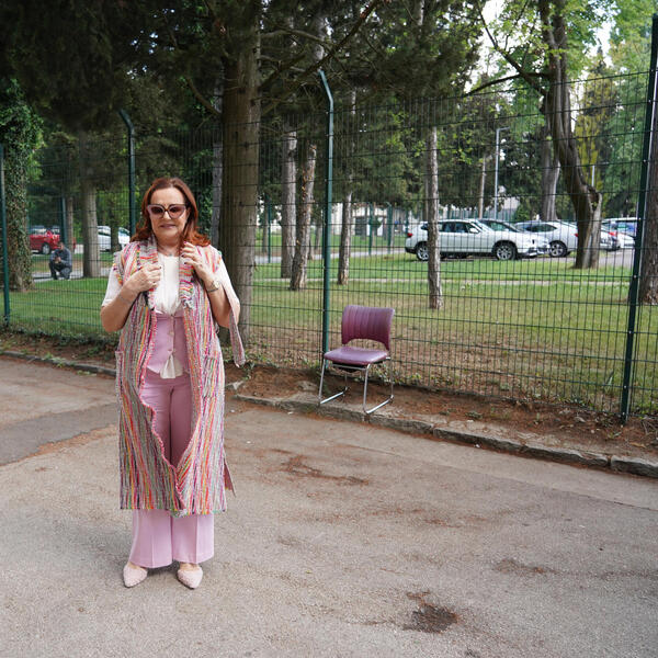 Belu majicu i roze pantalone i prsluk, pevačica je dodatno ‘začinila’ šarenim dugačkim prslukom na kojem dominiraju roze nijanse.
