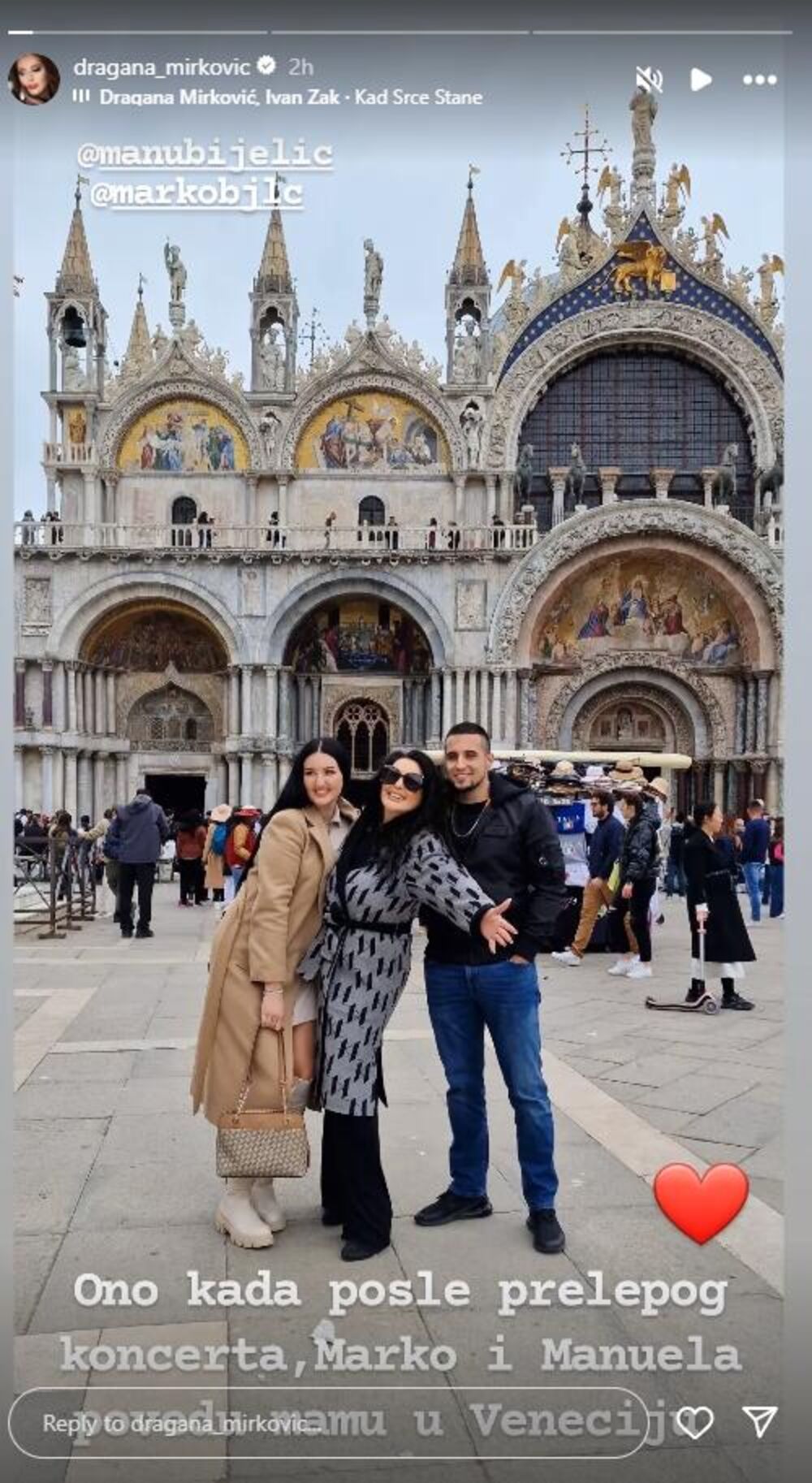 Na jednoj od fotografija Dragana je napisala sledeće: "Ono kada posle prelepog koncerta Marko i Manuela povedu mamu u Veneciju."