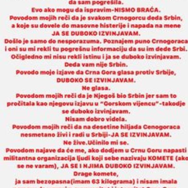 Izvinjavam se svakome koga je duboko uvredilo to što sam Crnogorce nazvala braćom. Posle svih pretnji juče, shvatila sam da vas je to pogodilo i da sam pogrešila.