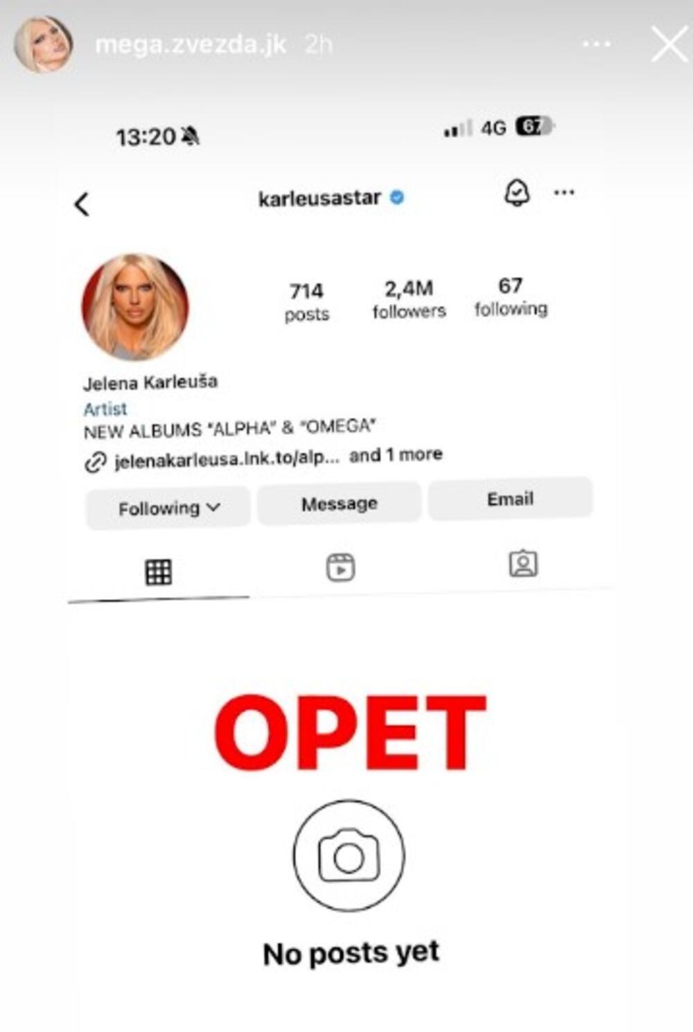 Jelena Karleuša izgleda da je ostala bez profila na Instagramu, budući da nije moguće naći njen profil u pretrazi. Brojni pratioci pišu na Tviteru da ih je blokirala, međutim, to nije istina - njen profil je jednostavno nestao.