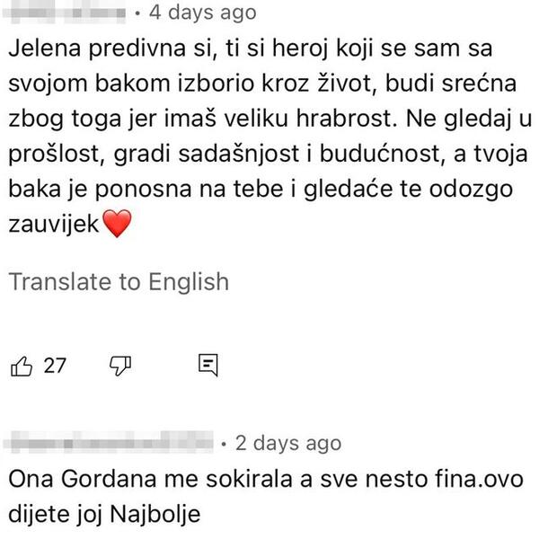 Jelena je rekla i da svojom majkom smatra svoju baku koja nažalost više nije među živima, te da ju je ona branila onda kada joj je kao detetu zaštita potrebna.