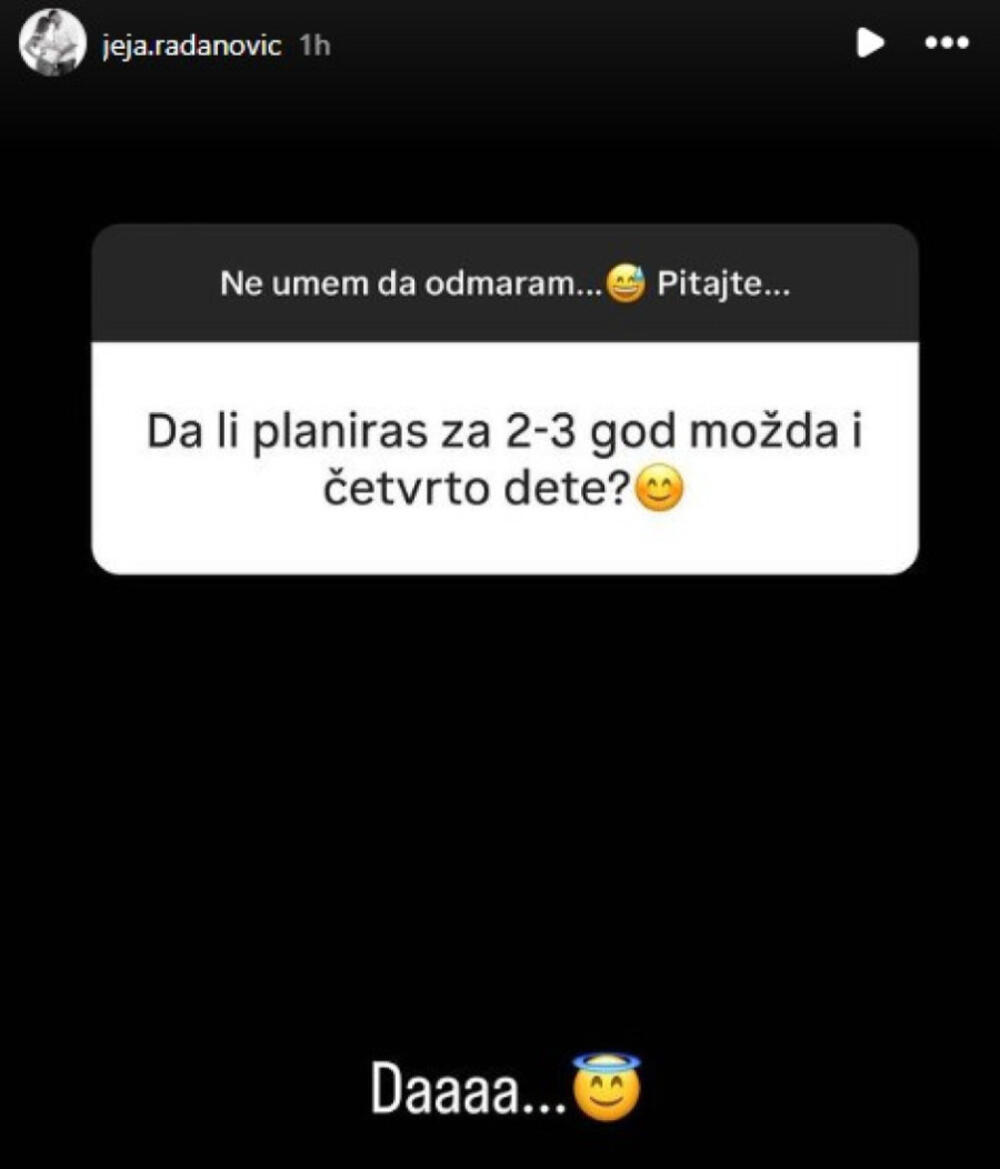 Sada, putem društvene mreže Instagranm, odgovarajući na pitanja fanova ona je otkrila da joj je četvrto dete i te kako u planu. Volela bi, kako je istakla, da danas-sutra sa Slobodanom dobije i jednu devojčicu.