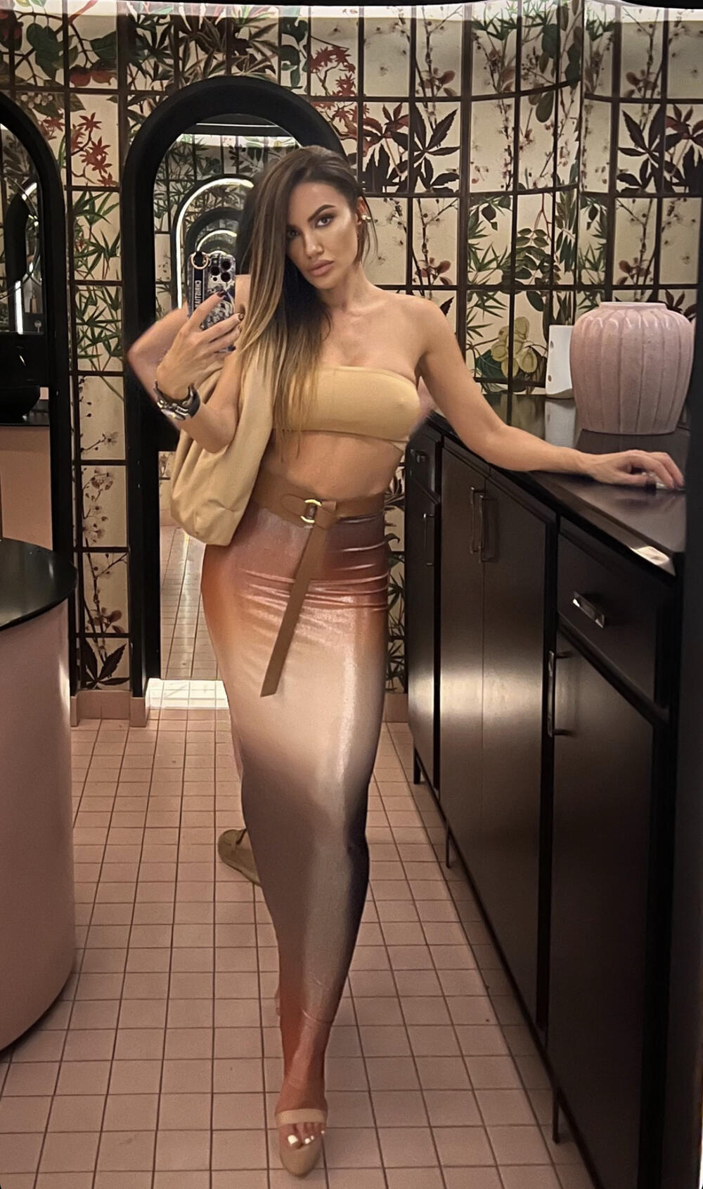 Sindi je nosila top bez brushaltera, te su se bujni silikoni lepo crtali, a dugačka suknja koja je skroz uz telo je pravi hit ove sezone.