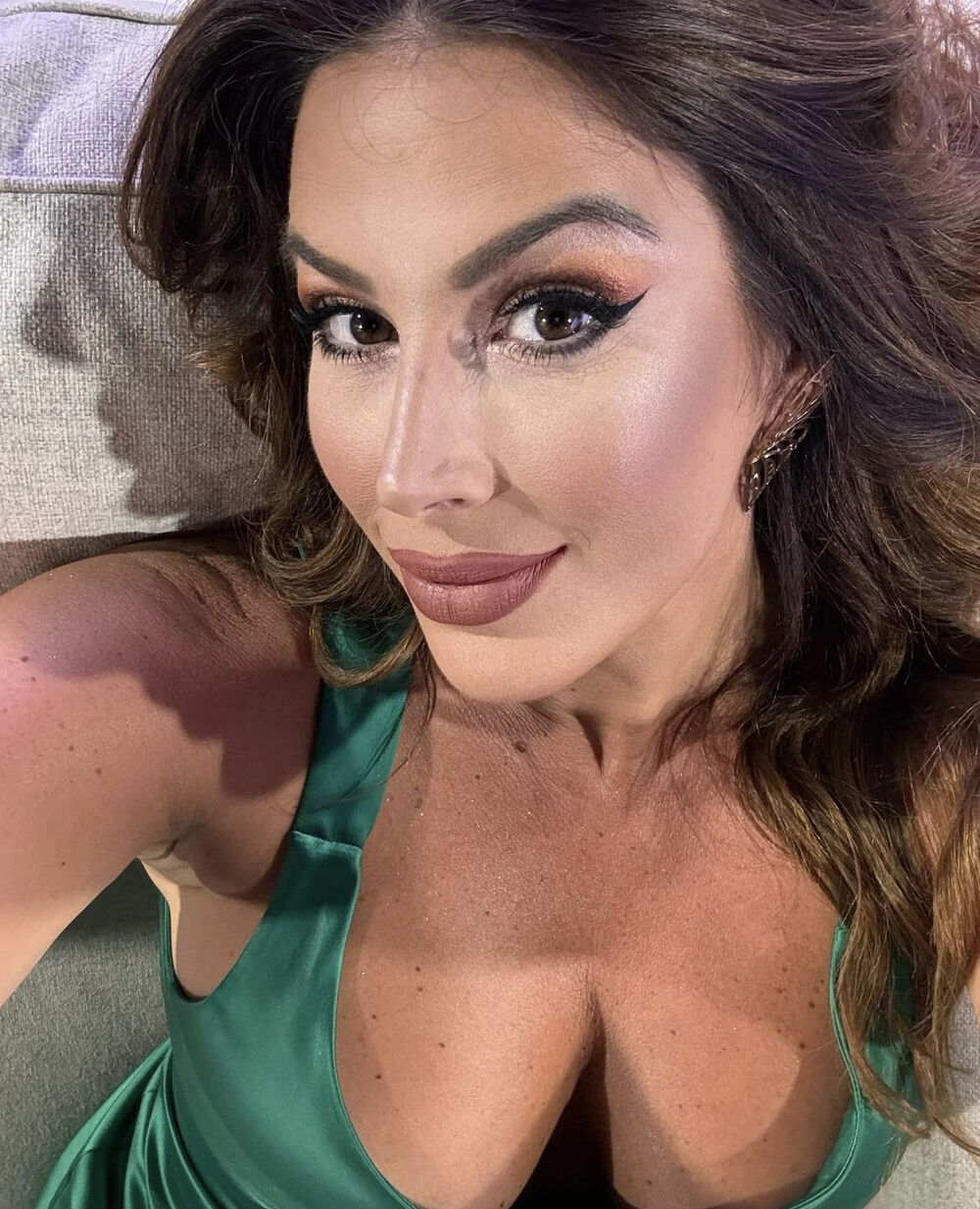 Zelena haljina ima jako dubok dekolte, te su bujne grudi u prvom planu.