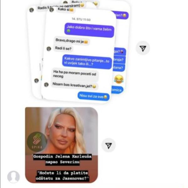 Podsetimo, bivši fudbaler, a sad fudbalski menadžer je u više navrata slao poruke Severini koja mu je odgovorila u strogom tonu. Ona je verovatno pokušala da isprovocira JK time što joj je poslala privatnu prepisku sa njenim, još uvek zakonitim suprugom Duškom Tošićem, iz koje se može zaključiti da je bivši fudbaler pokušao da flertuje sa Severinom, za šta ona nije bila zainteresovana.
