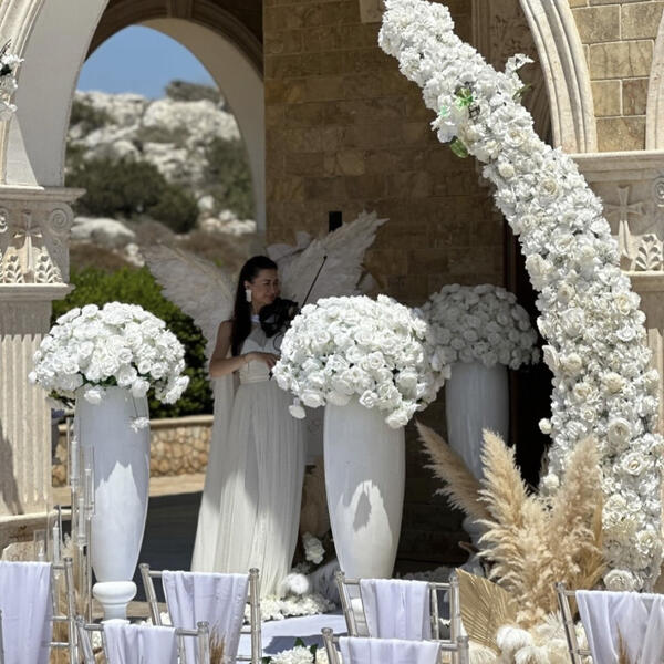 Imanje na kom će se obaviti ceremonija venčanja je u belim detaljima, a tu su i devojke u belim haljinama sa krilima anđela koje sviraju violinu.