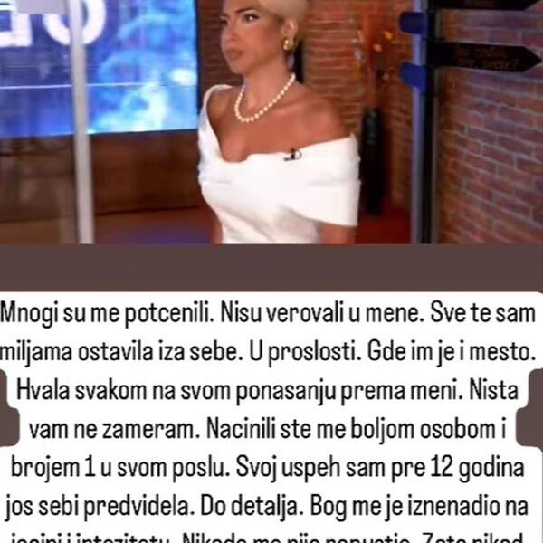 - Mnogi su me potcenili, Nisu verovali u mene. Sve te sam miljama ostavila iza sebe. U prošlosti. Gde im je i mesto. Hvala svakome na svom ponašanju prema meni. Ništa vam ne zameram. Načinili ste me boljom osobom i brojem 1 u svom poslu. Svom uspeh sam pre 12 godina još sebi predvidela. Do detalja. Bog me je iznenadio na jačini i intenzitetu. Nikada me nije napustio. Zato nikad ne kažem da sam uspela sama. Nisam. Uz Božiju pomoć ostvarila sam sve ono što nisam sebi predvidela. A znate šta je još važnije? Ovo je samo početak svega što me čeka u ovozemaljskom životu. Živećemo ga zajedno - napisala je voditeljka.