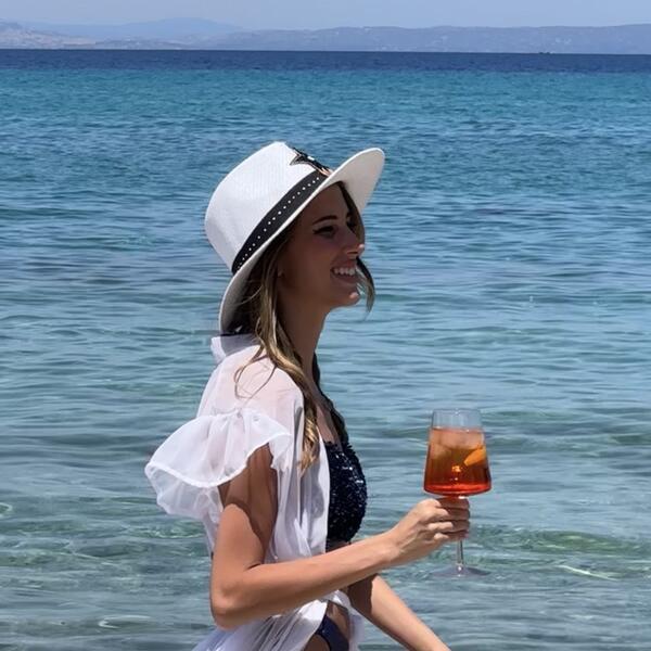 Ispijala je koktel u kupaćem kostimu, dok je na sebi imala beli šešir i ogrtač. Moderna i na plaži, nema šta!