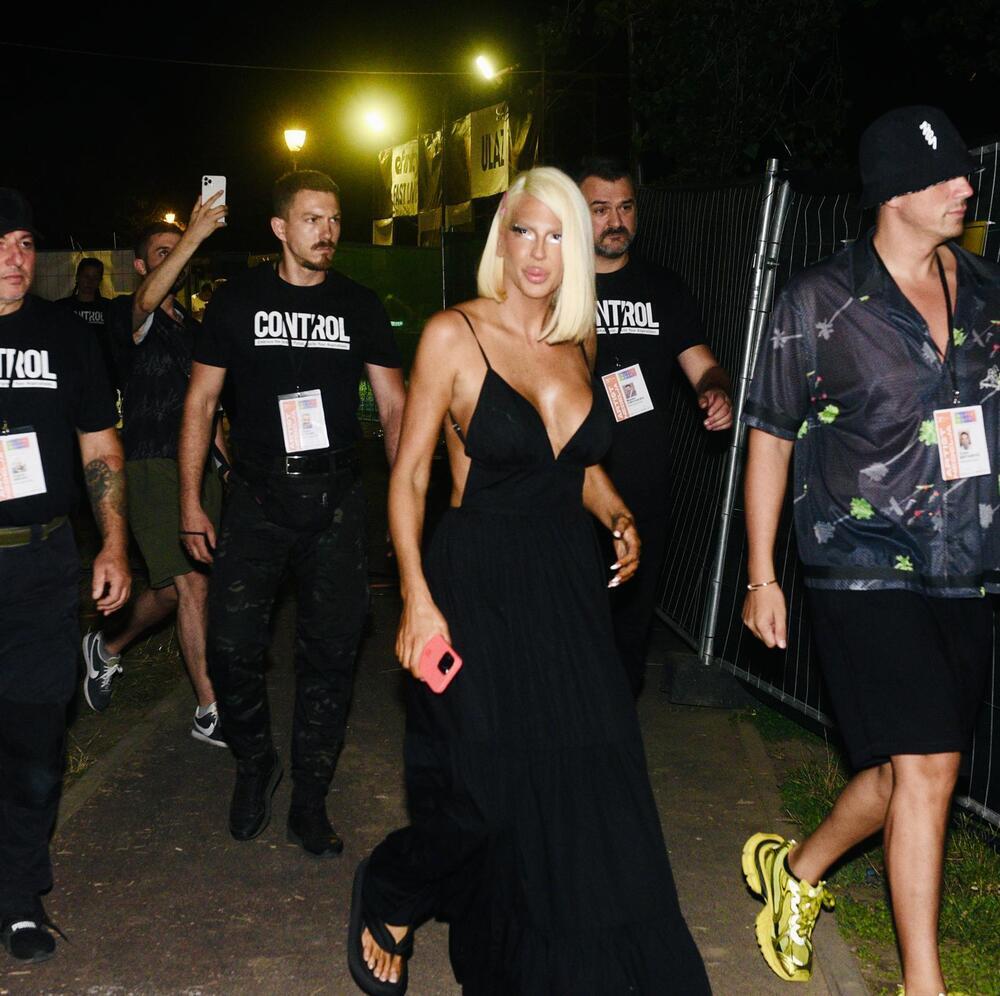 Ona se sa novom paž frizurom u dugoj crnoj haljini sa otvorenim leđima i u pratnji 10 članova obezbeđenja hitrim korakom uputila ka bekstejdžu kako bi se pripremila za večerašnji spektakl, koji će pomeriti sve granice srpskog šou-biznisa.