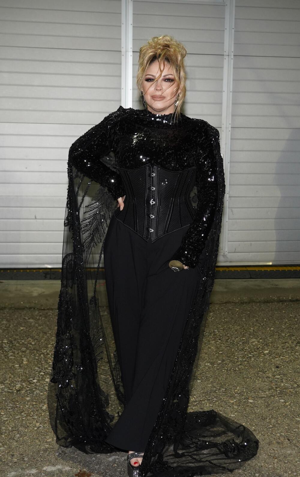 Nosila je crni plašt, crnu bluzicu sa šljokicama, korset i svečane pantalone.